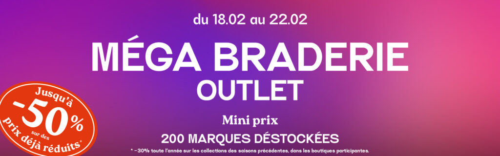 *Sur une sélection de marques, hors nouveaux arrivages. Remise valable sur le prix outlet.